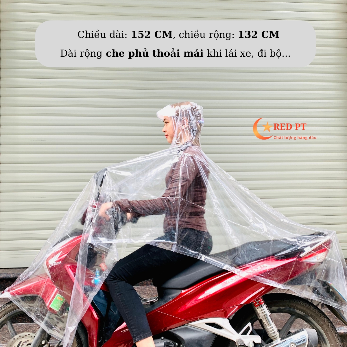 – Chiều dài 152 cm ( cả mũ nón ), chiều rộng 132 cm, giúp che kín thoải mái khi đi xe máy, đi bộ…