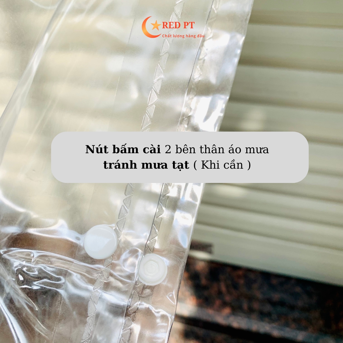 – Nút bấm 2 bên hông áo mưa có thể cài lại khi cần thành áo mưa 1 người, tránh bị mưa tạt ướt.